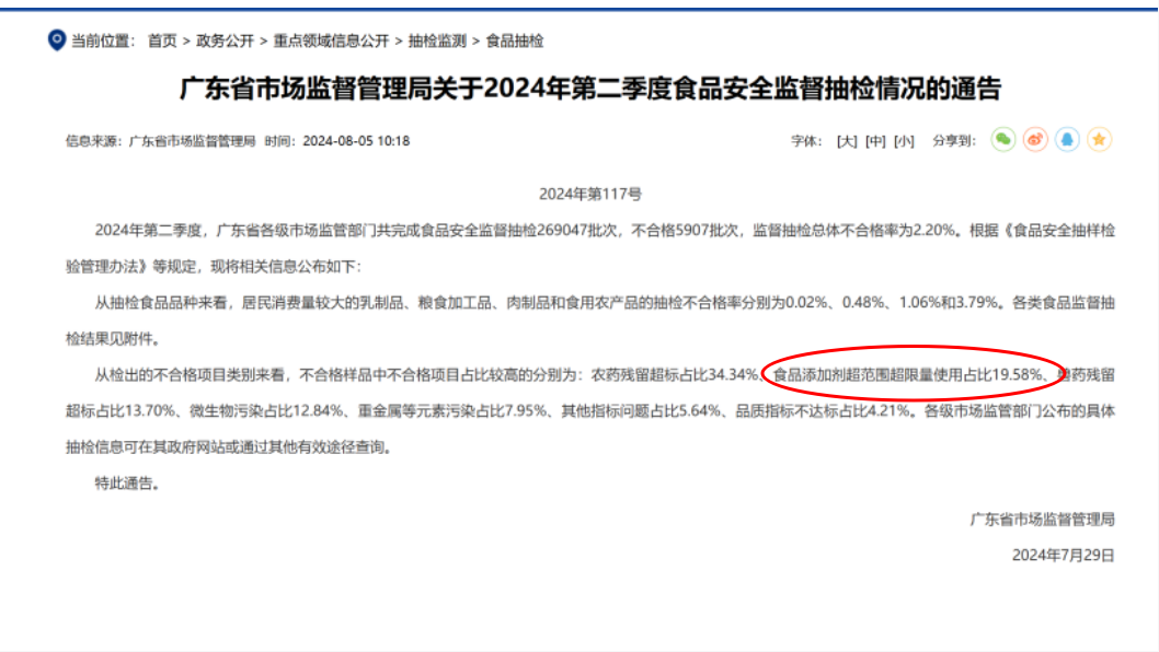 根據(jù)廣東省市場(chǎng)監(jiān)督管理局官網(wǎng)發(fā)布的2024年第二季度食品安全監(jiān)督抽檢情況的通告可知,食品添加劑超范圍超限量使用的情況占不合格批次的19.58%,不合格率排名第二。
