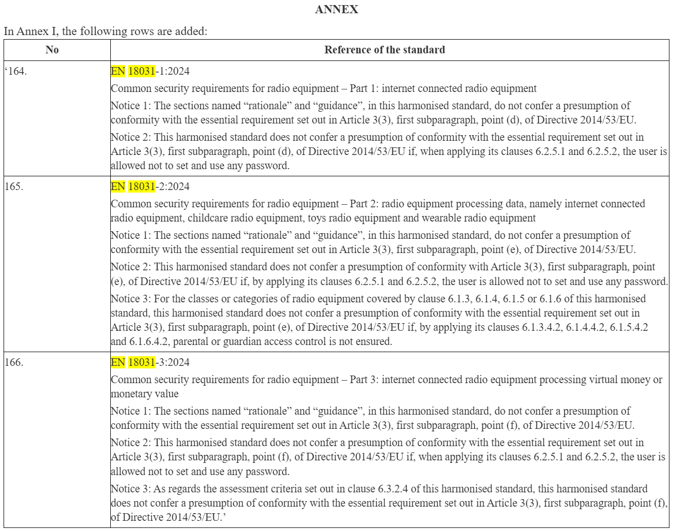 隨著2025年1月30日Implementing Decision (EU) 2025/138在歐盟官網(wǎng)的發(fā)布,EN 18031已正式被歐盟官方引用為RED-DA法規(guī)的統(tǒng)一協(xié)調(diào)標準,這標示歐盟在無線電產(chǎn)品領(lǐng)域的網(wǎng)絡(luò)安全合規(guī)邁出了重大的一步。雖然已被列入OJ,但官方也同時表示,EN18031的某些條款在RED-DA法規(guī)的符合性上仍具有限制性。