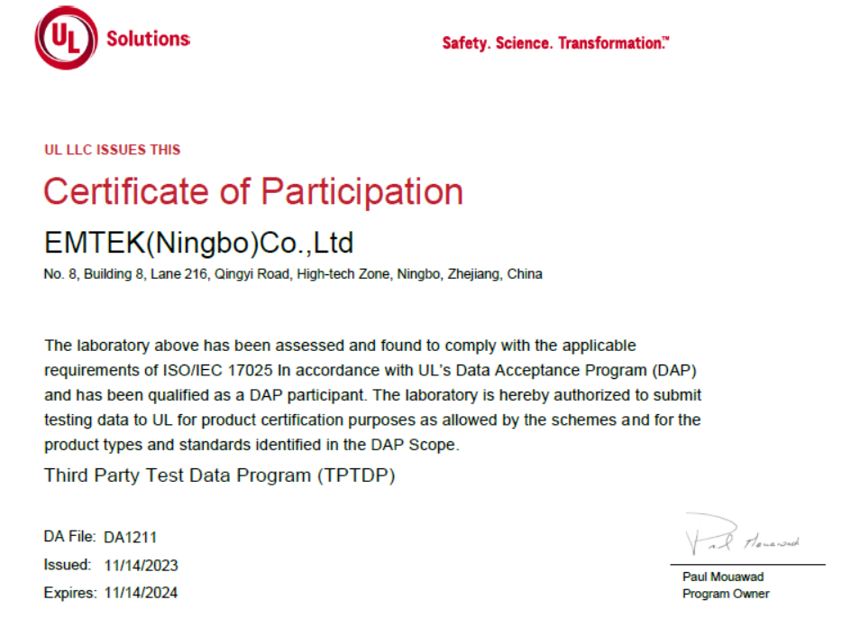信測(cè)標(biāo)準(zhǔn)(寧波)公司長(zhǎng)期以來(lái)同UL保持密切友好合作,是UL公司多標(biāo)準(zhǔn)TPTDP免目擊實(shí)驗(yàn)室和WTDP目擊實(shí)驗(yàn)室,為客戶(hù)縮短認(rèn)證周期、節(jié)約差旅費(fèi)/成本,更好體驗(yàn)信測(cè)標(biāo)準(zhǔn)一站式、通全球的優(yōu)質(zhì)服務(wù)。