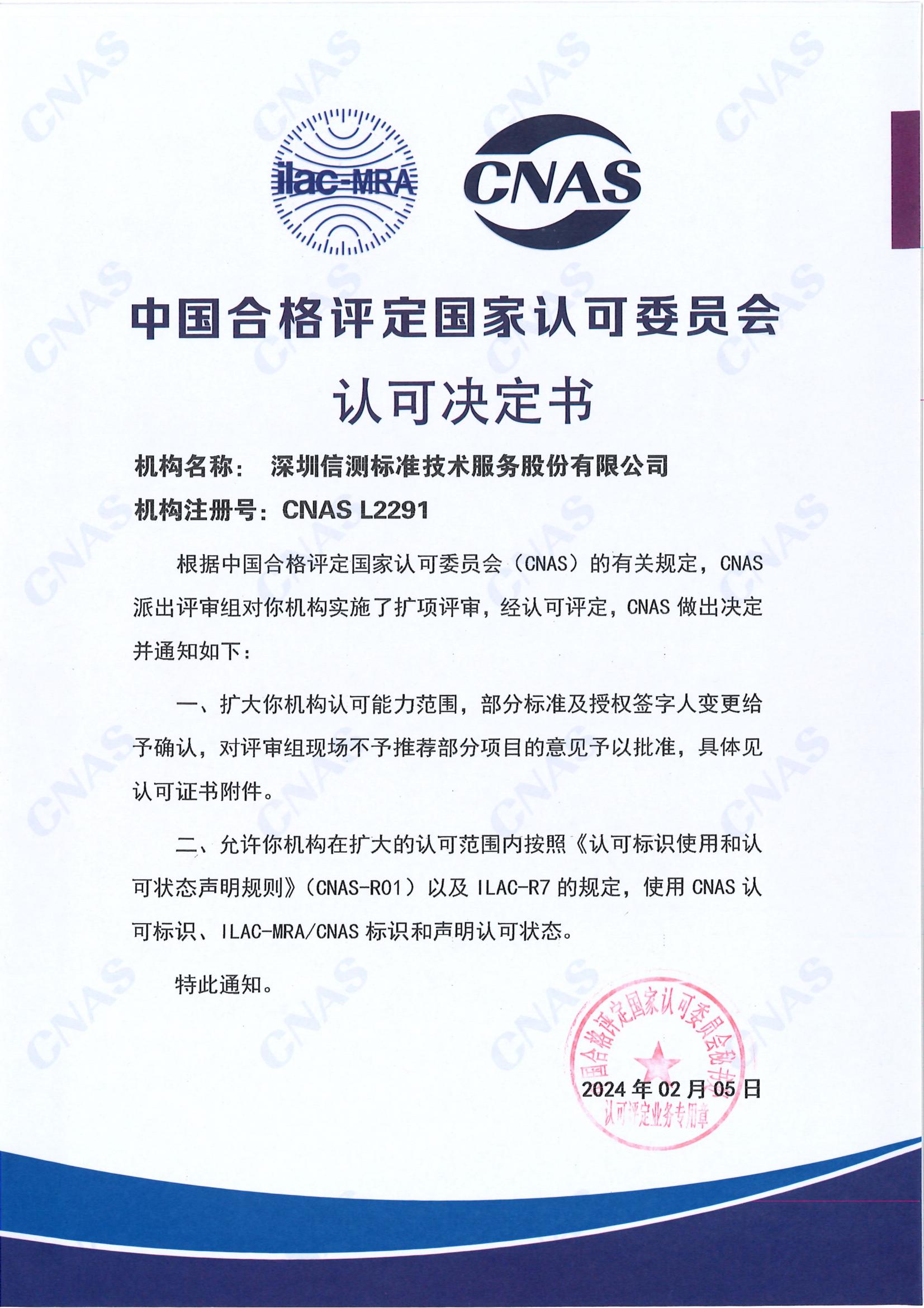 2024年2月5日,深圳信測標(biāo)準(zhǔn)技術(shù)服務(wù)股份有限公司順利獲得新能源場站和儲(chǔ)能電站檢測標(biāo)準(zhǔn)和判定標(biāo)準(zhǔn)的CNAS資質(zhì),在光伏電站、風(fēng)電場/風(fēng)電機(jī)組、儲(chǔ)能的外場檢測項(xiàng)目上擴(kuò)充了新能力。本次CNAS擴(kuò)項(xiàng)認(rèn)可范圍共覆蓋4類別28份標(biāo)準(zhǔn)61項(xiàng)測試能力。
