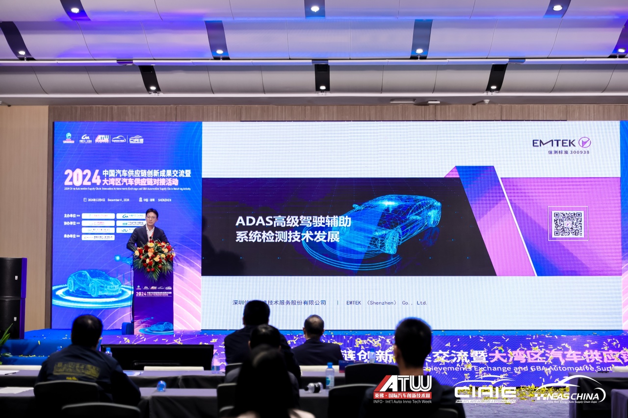 2024年12月4日,由中國汽車工業(yè)協(xié)會、廣東省汽車行業(yè)協(xié)會主辦,廣汽零部件有限公司、廣東省汽車工程學會、廣州汽車工業(yè)行業(yè)協(xié)會、廣州市智能網(wǎng)聯(lián)與新能源汽車產(chǎn)業(yè)人才聯(lián)合會等單位協(xié)辦,英佛會議展覽(上海)有限公司承辦的“2024中國汽車供應(yīng)鏈創(chuàng)新成果交流暨大灣區(qū)汽車供應(yīng)鏈對接活動”在深圳國際會展中心舉辦。信測標準總經(jīng)理袁奇先生出席活動并分享了主題為《ADAS高級駕駛輔助系統(tǒng)檢測技術(shù)發(fā)展》的演講。