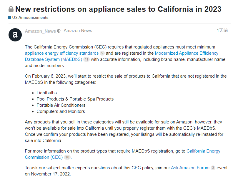 平臺(tái)商家在銷售上述商品時(shí),若未在CEC的MAEDbS正確注冊(cè),商品將無(wú)法通過(guò)亞馬遜在加利福尼亞州銷售。只有亞馬遜確認(rèn)商品已完成注冊(cè)后,商品才會(huì)自動(dòng)恢復(fù),允許在加利福尼亞州銷售。