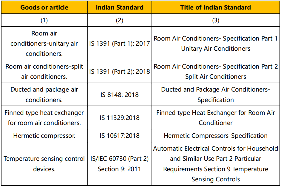 2022 年 12 月 21 日,印度 BIS 發(fā)布公告,空調(diào)及相關(guān)設(shè)備零件,密封壓縮機和溫度傳感控制器產(chǎn)品強制安規(guī) ISI 認(rèn)證的實施時間再次推遲實施,下列產(chǎn)品的強制日期推遲到 2023 年 10 月 1 日。