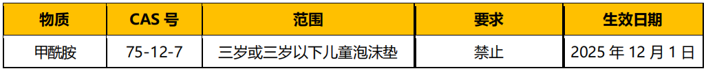 2023 年1 月26 日,美國紐約州發(fā)布草案 S02983《無甲酰胺兒童產(chǎn)品法》,提議禁止在三歲及三歲以下兒童泡沫墊產(chǎn)品中使用甲酰胺。如法案通過,該要求將于2025 年 12 月1 日正式實施。