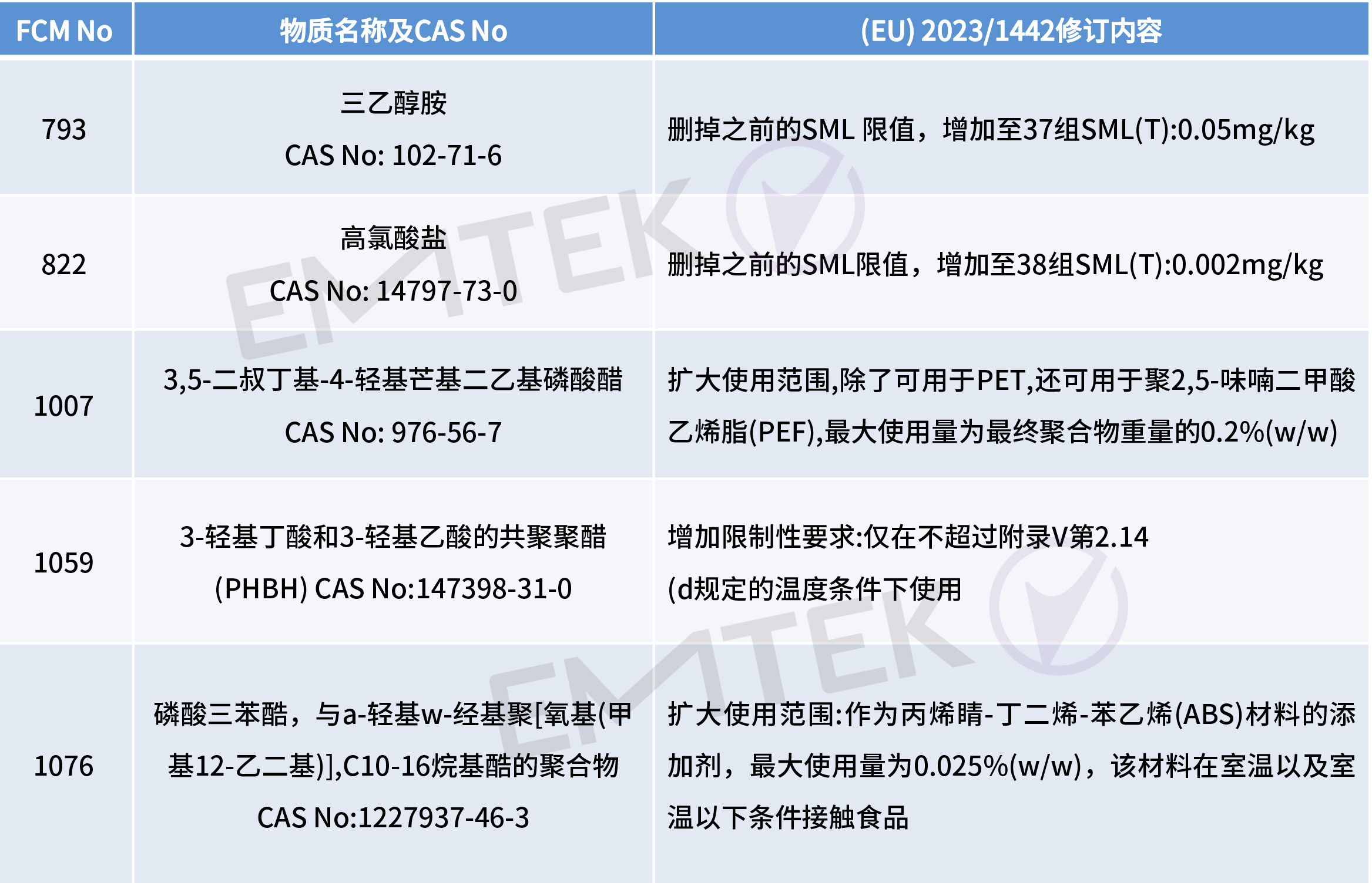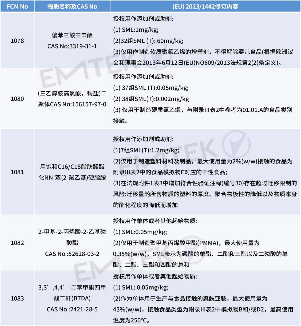2023年7月12日,歐盟官方公報發(fā)布塑料食品接觸材料法規(guī)(EU) No 10/2011的最新修訂法規(guī) (EU) 2023/1442。新法規(guī)將于2023年8月1日生效,新法規(guī)針對附件I中部分授權物質進行刪減,修訂及新增。