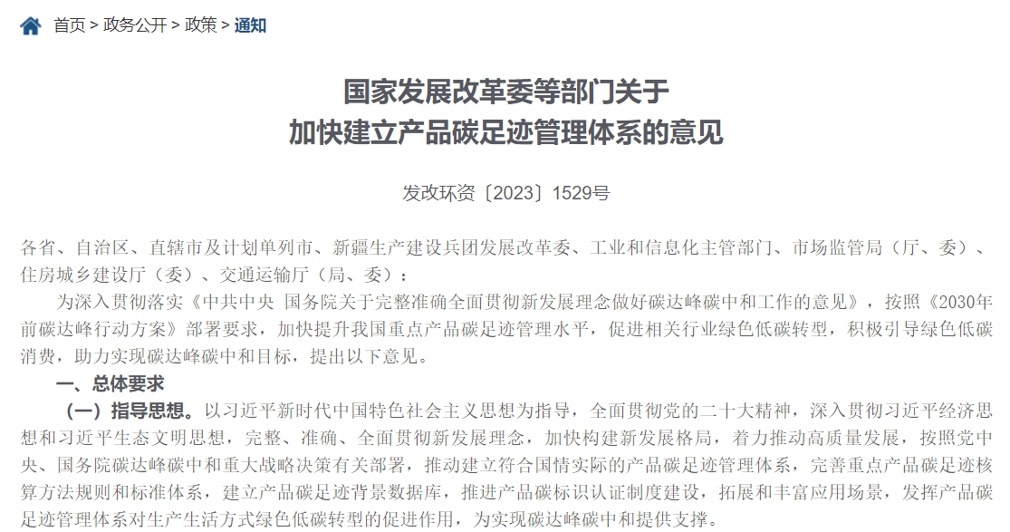 國家發(fā)展改革委、工業(yè)和信息化部、市場監(jiān)管總局、住房城鄉(xiāng)建設(shè)部以及交通運輸部于 2023 年 11 月聯(lián)合發(fā)布了關(guān)于加快建立產(chǎn)品碳足跡管理體系的意見(以下簡稱“意見”),加快提升我國重點產(chǎn)品碳足跡管理水平,促進相關(guān)行業(yè)綠色低碳轉(zhuǎn)型,積極引導(dǎo)綠色低碳消費,助力實現(xiàn)碳達峰碳中和目標(biāo)。