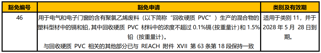 此外,該豁免的范圍與 REACH 附件 XVII 第 63 條中有關(guān) PVC2 中鉛的規(guī)定對(duì)回收 PVC 中鉛的減損一致。因此,EC 已授予 RoHS 指令附件 I 第 11 類的豁免。表 A 豁免詳情。
