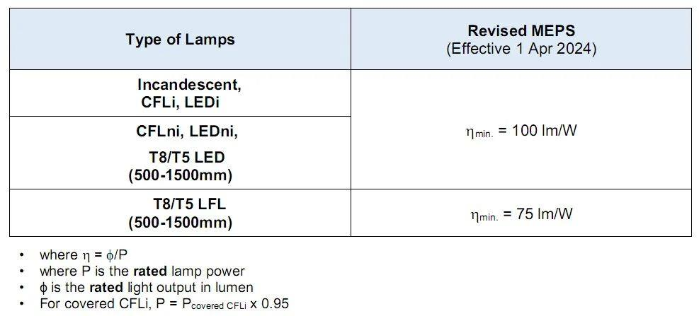 2024 年4 月 1 日起,新加坡 NEA 強(qiáng)制受管制的lamps 的能效更新要求如下: