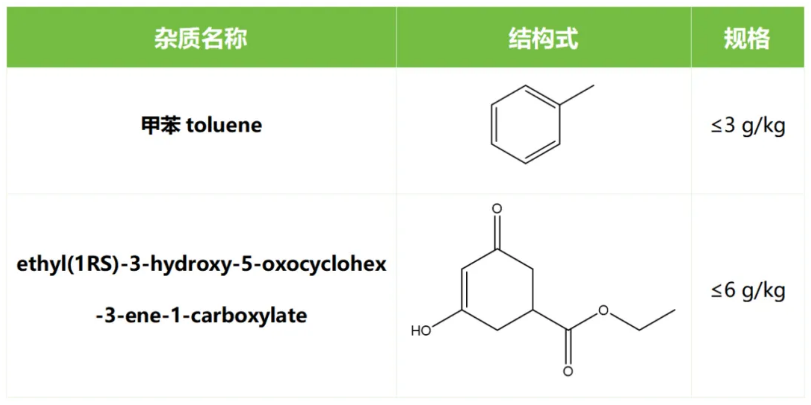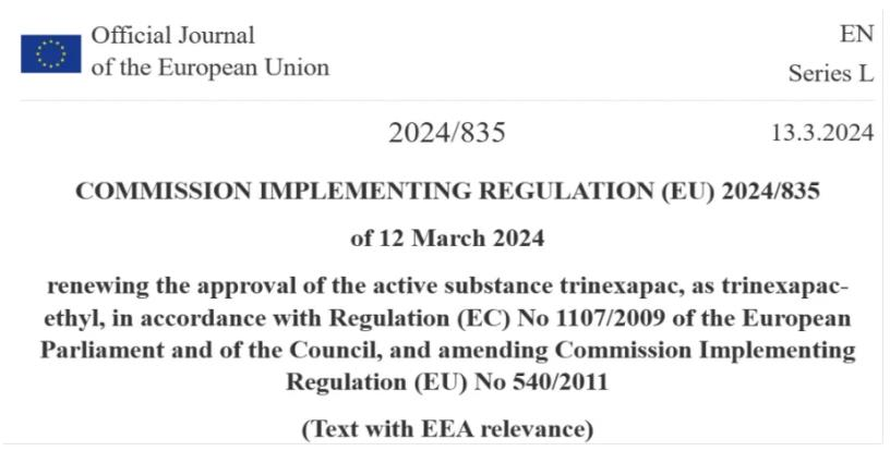 2024 年 3 月中旬,歐盟委員會(huì)(EC)發(fā)布正式?jīng)Q議,基于歐盟農(nóng)藥法規(guī)(REGULATION (EC) No 1107/2009),批準(zhǔn)活性物質(zhì)抗倒酯(trinexapac-ethyl)的有效期延長(zhǎng)至 2039 年 4 月 30 日。至此抗倒酯完成此輪再評(píng)審,再評(píng)審后抗倒酯的活性物質(zhì)規(guī)格由 940 g/kg 提升至 950 g/kg,并新增以下兩個(gè)相關(guān)雜質(zhì):