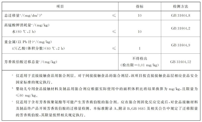 1) 對(duì)于總遷移量、高錳酸鉀消耗量以及重金屬的限量要求僅適用于直接接觸食品用黏合劑層;