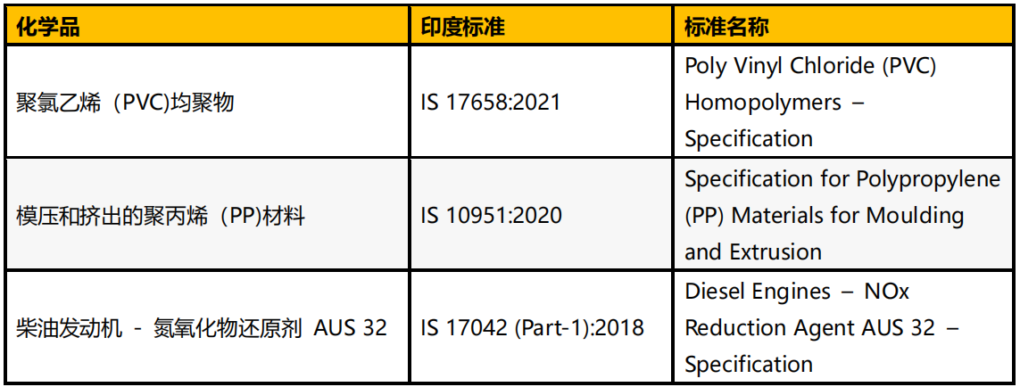 這 3 類化學(xué)品的 QCOs 將于 2024 年 8 月 25 日起強(qiáng)制執(zhí)行。以下是 3 類化學(xué)品需具體執(zhí)行的印度標(biāo)準(zhǔn):