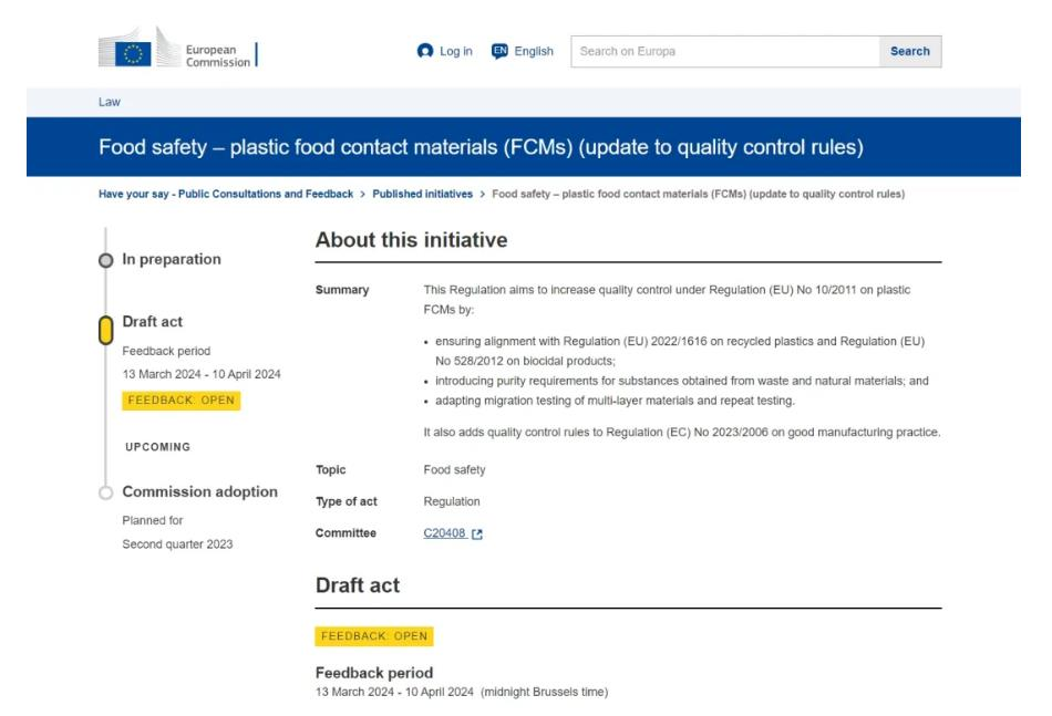 2024 年 3 月,歐盟委員會(huì)公布塑料食品接觸材料法規(guī) Regulation (EU) No. 10/2011 的更新草案,并開啟公眾意見征求。這將是該法規(guī)自發(fā)布以來(lái)的第 18 次更新。