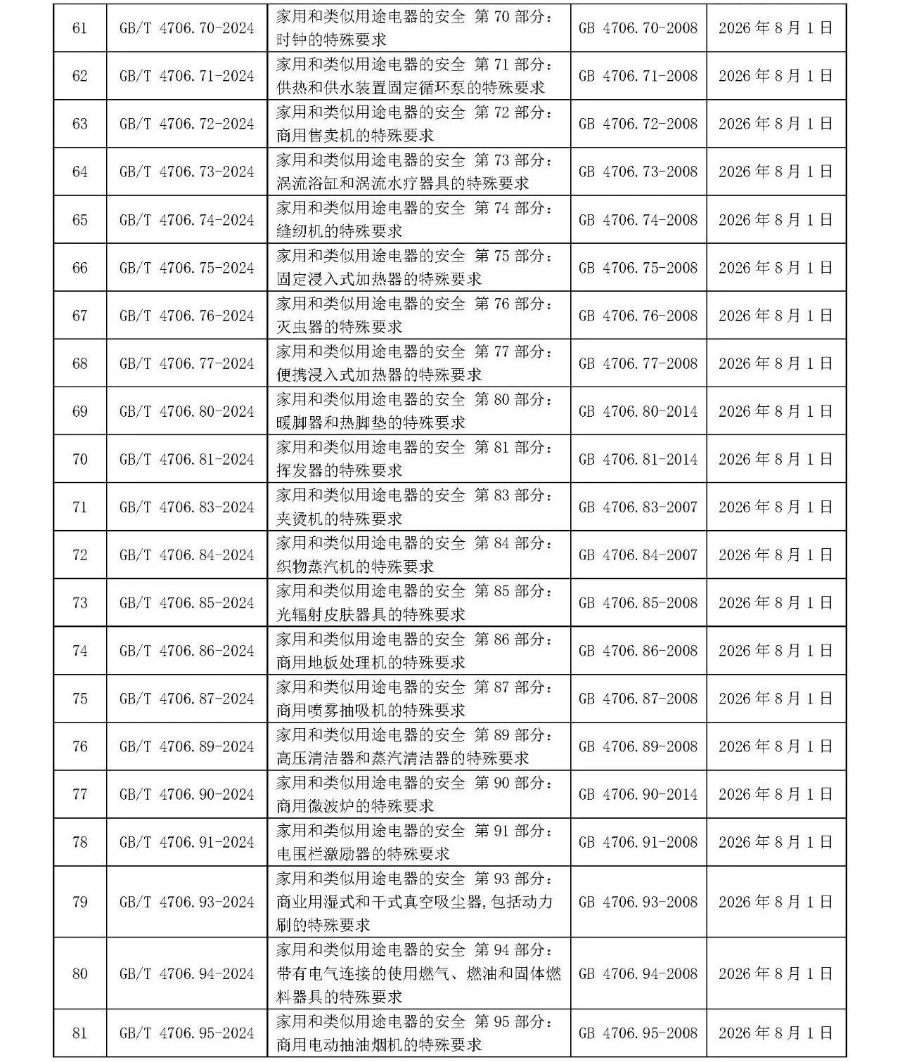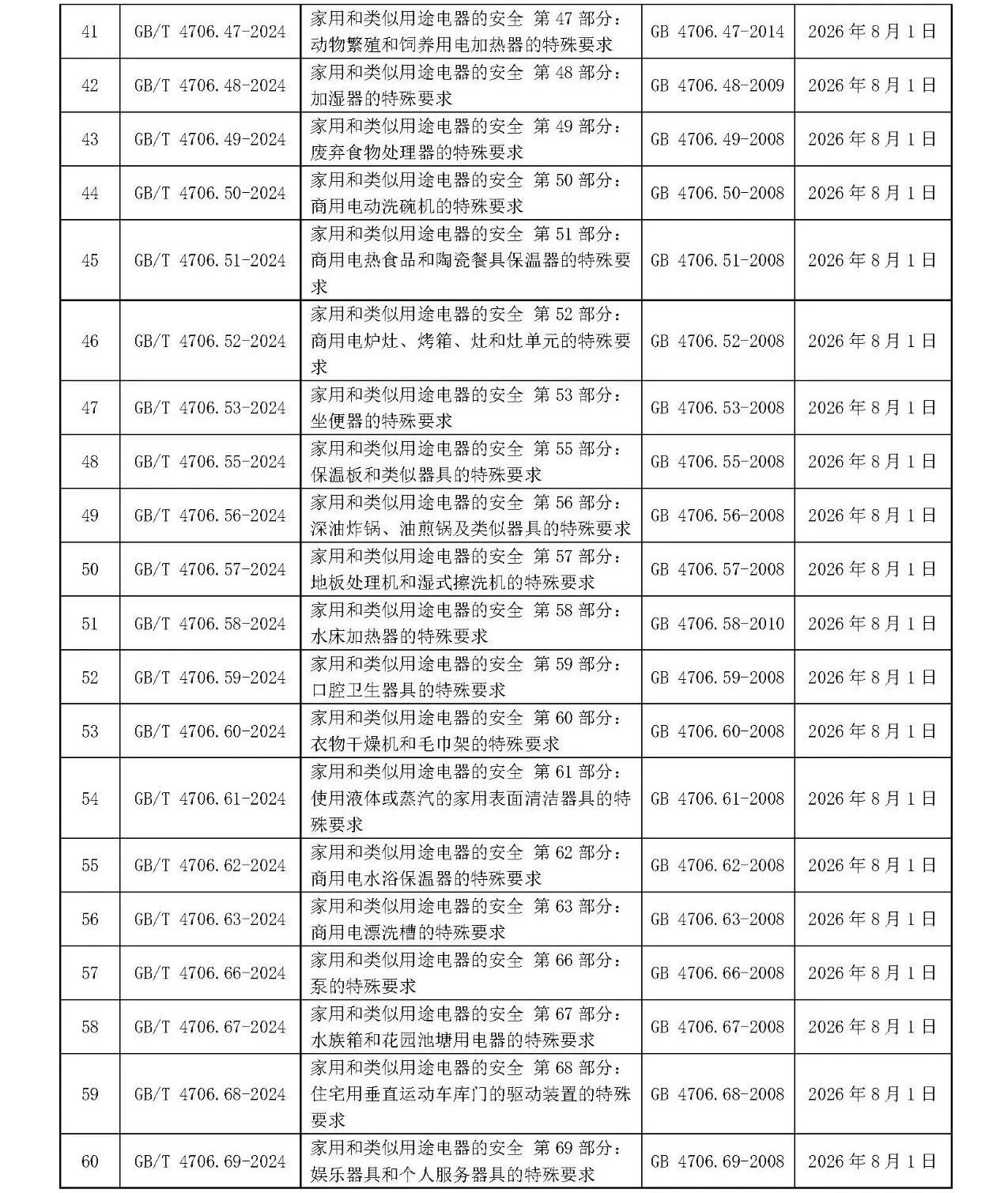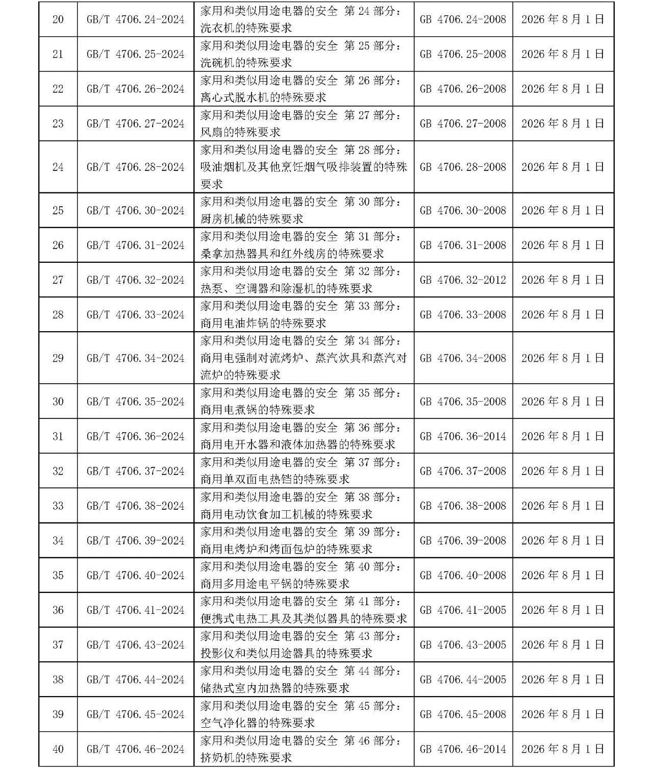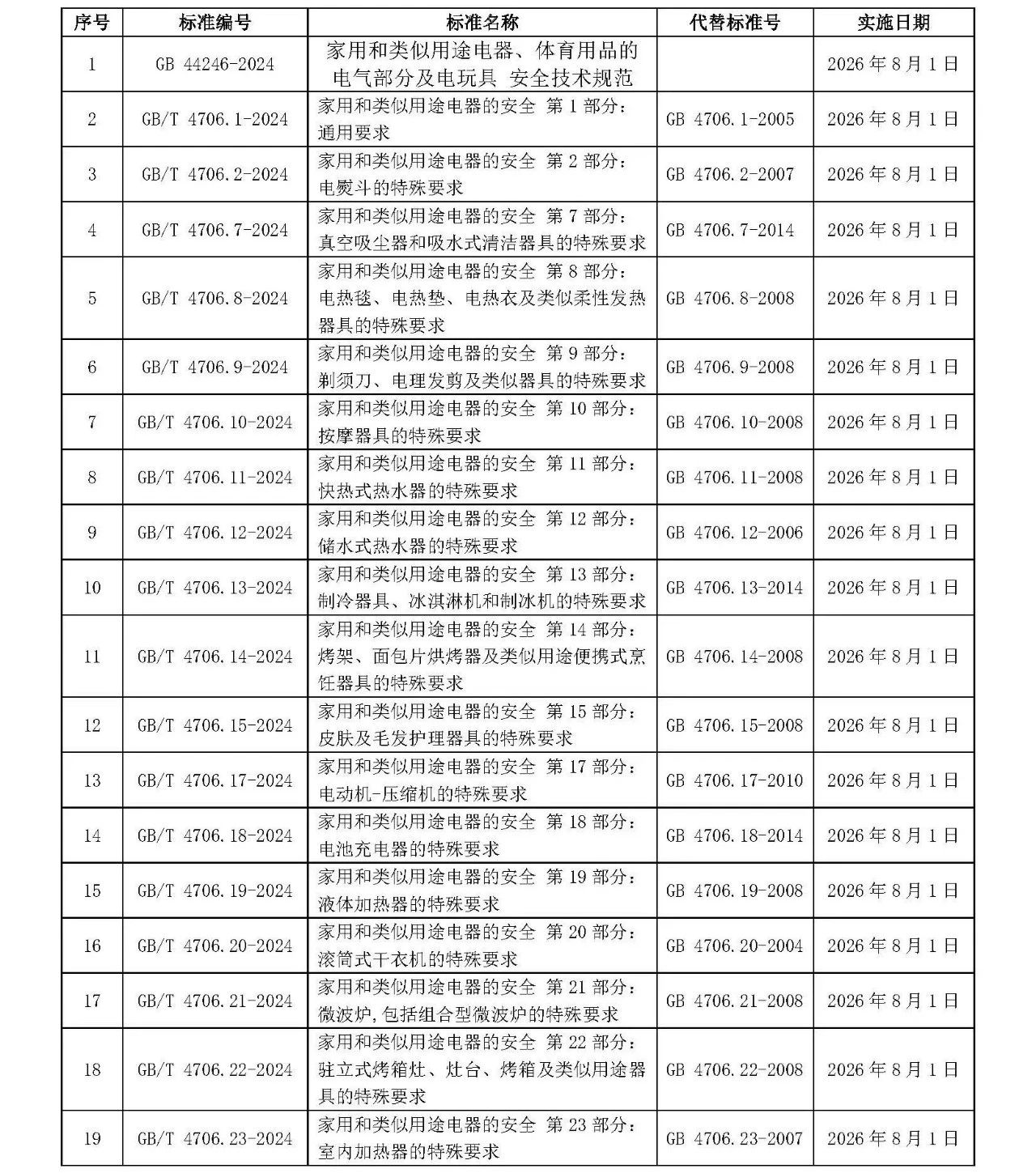 2024年7月24日,國家標(biāo)準(zhǔn)化管理委員會發(fā)布《關(guān)于批準(zhǔn)發(fā)布<壓力容器 第1部分:通用要求>等218項國家標(biāo)準(zhǔn)和1項國家標(biāo)準(zhǔn)修改單的公告》(中華人民共和國國家標(biāo)準(zhǔn)公告 2024年第15號)及《關(guān)于批準(zhǔn)發(fā)布<家用和類似用途單相插頭插座 型式、基本參數(shù)和尺寸>等12項強(qiáng)制性國家標(biāo)準(zhǔn)和1項強(qiáng)制性國家標(biāo)準(zhǔn)修改單的公告》(中華人民共和國國家標(biāo)準(zhǔn)公告 2024年第16號)。其中批準(zhǔn)發(fā)布GB 44246-2024《家用和類似用途電器、體育用品的電氣部分及電玩具 安全技術(shù)規(guī)范》強(qiáng)制性國家標(biāo)準(zhǔn)及GB/T 4706.1-2024《家用和類似用途電器的安全 第1部分:通用要求》等102項家電推薦性國家標(biāo)準(zhǔn),共計103項。