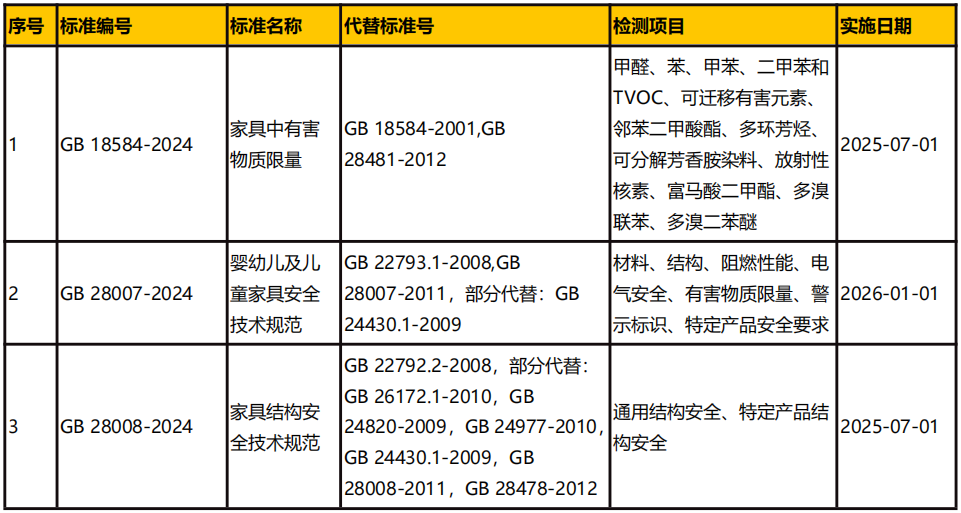 為充分發(fā)揮標(biāo)準(zhǔn)在家具產(chǎn)業(yè)中的規(guī)范引領(lǐng)作用,推動提升家具產(chǎn)品質(zhì)量安全水平,國家市場監(jiān)督管理總局,國家標(biāo)準(zhǔn)化管理委員會于2024年7月發(fā)布GB 18584-2024《家具中有害物質(zhì)限量》、GB 28007-2024《嬰幼兒及兒童家具安全技術(shù)規(guī)范》、GB 28008-2024《家具結(jié)構(gòu)安全技術(shù)規(guī)范》3項家具強(qiáng)制性國家標(biāo)準(zhǔn)。該3項標(biāo)準(zhǔn)由工業(yè)和信息化部歸口。三份強(qiáng)制性國家標(biāo)準(zhǔn)分別從限制家具有害物質(zhì)、家具結(jié)構(gòu)安全以及保障特殊人群安全三個方面制定了相關(guān)的技術(shù)指標(biāo)。