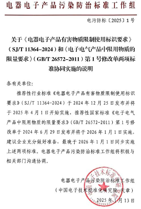 2024 年 1 月 13 日,中國(guó)電器電子產(chǎn)品污染防治標(biāo)準(zhǔn)工作組發(fā)布了關(guān)于《電器電子產(chǎn)品有害物質(zhì)限制使用標(biāo)識(shí)要求》(SJ/T11364-2024)和《電子電氣產(chǎn)品中限用物質(zhì)的限量要求》(GB/T26572-2011)第 1 號(hào)修改單兩項(xiàng)標(biāo)準(zhǔn)協(xié)同實(shí)施的說(shuō)明通知。