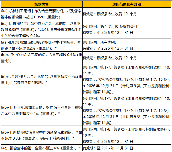 針對(duì)鋼合金、鋁合金、銅合金中的鉛豁免,草案擬更新附件 III 中第 6(a)、6(a)- I、6(b)、6(b)- I、6(b)- II和 6(c)項(xiàng)條款。