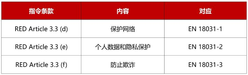 歐盟于 2024 年 11 月 30 日公告 EN 18031 標(biāo)準(zhǔn),分別為 EN 18031-1:2024, EN 18031-2:2024 , EN 18031-3:2024 。將于 2025-02-28 正式 DOP,這意味著將有一個(gè)專用的 EN 標(biāo)準(zhǔn)來(lái)證明產(chǎn)品符合 RED 指令中的網(wǎng)絡(luò)安全要求。