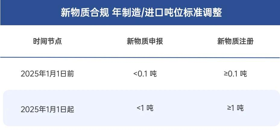 涉及申報(bào)噸位調(diào)整(0.1 噸→1 噸)和分類標(biāo)識(shí)證明依據(jù)的事項(xiàng),自 2025 年 1 月 1 日起執(zhí)行,涉及官方有害性審查和信息公開的事項(xiàng),自同年 8 月 7 日起執(zhí)行。