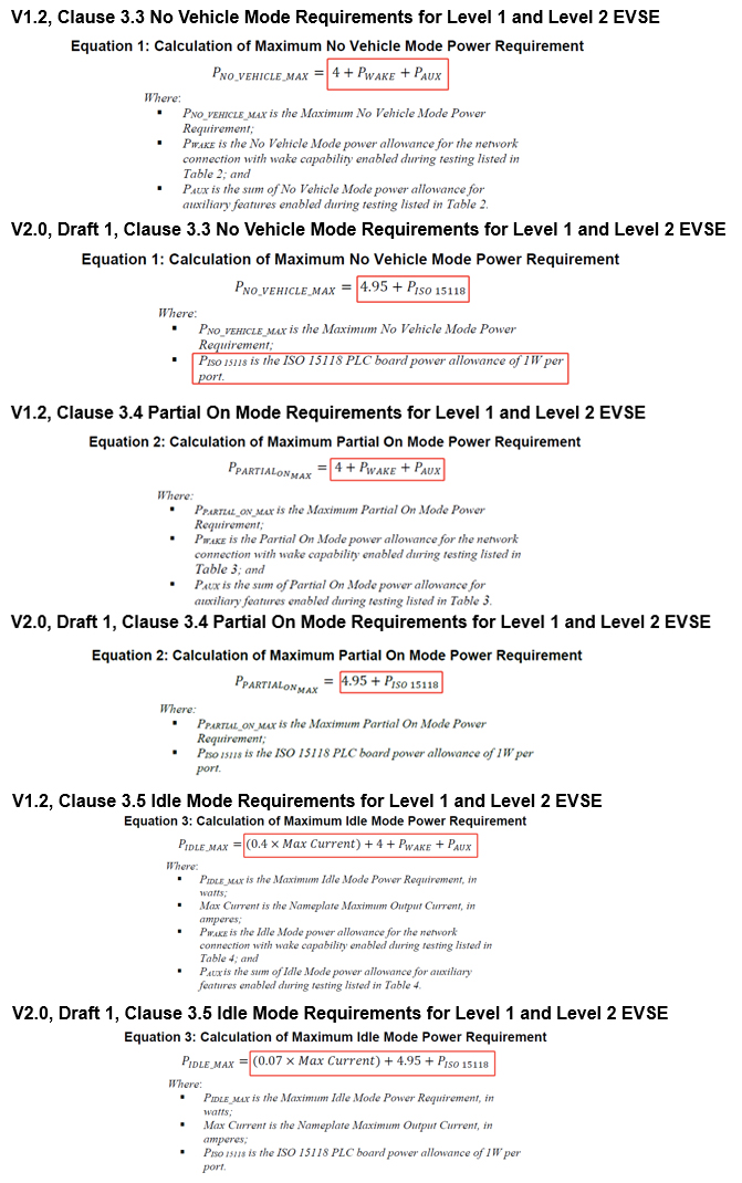 4、修改了AC充電樁在No Vehicle,Partial On,Idle模式下功率要求的計算公式,去掉了網(wǎng)絡喚醒(PWAKE)和輔助功能(PAUX)的加權值,增加了ISO 15118(PISO 15118)的加權值。